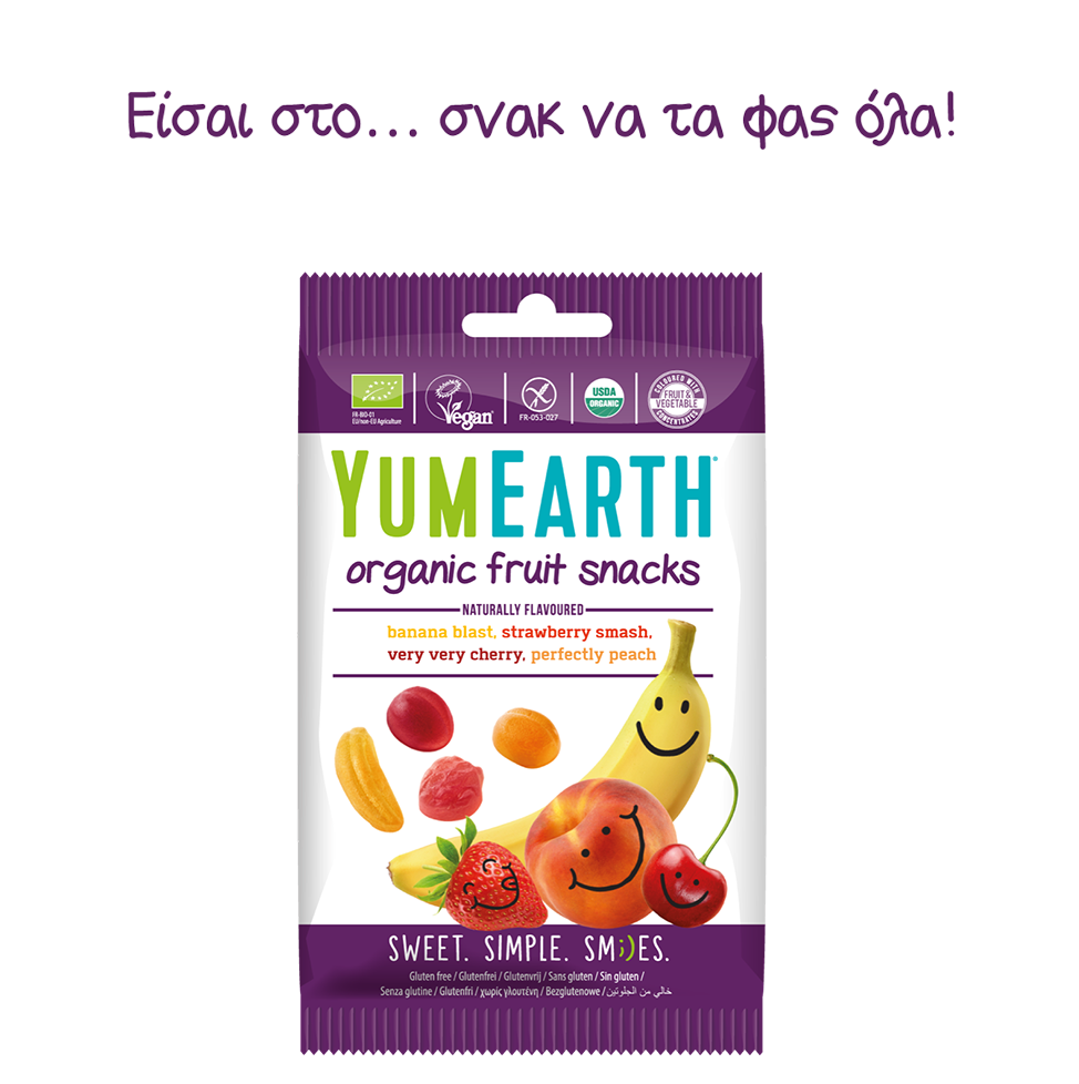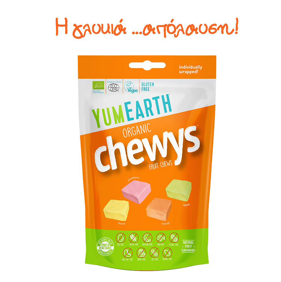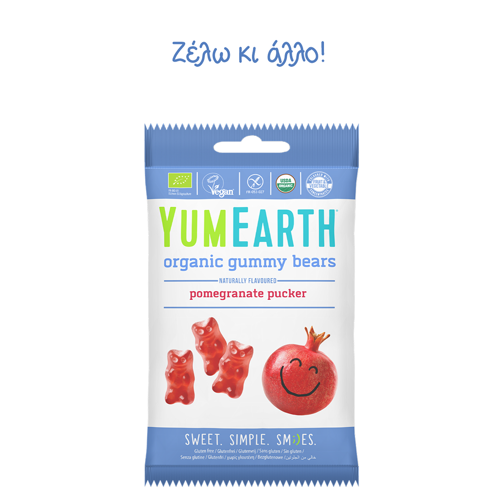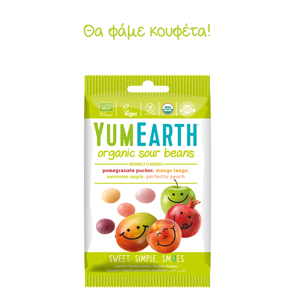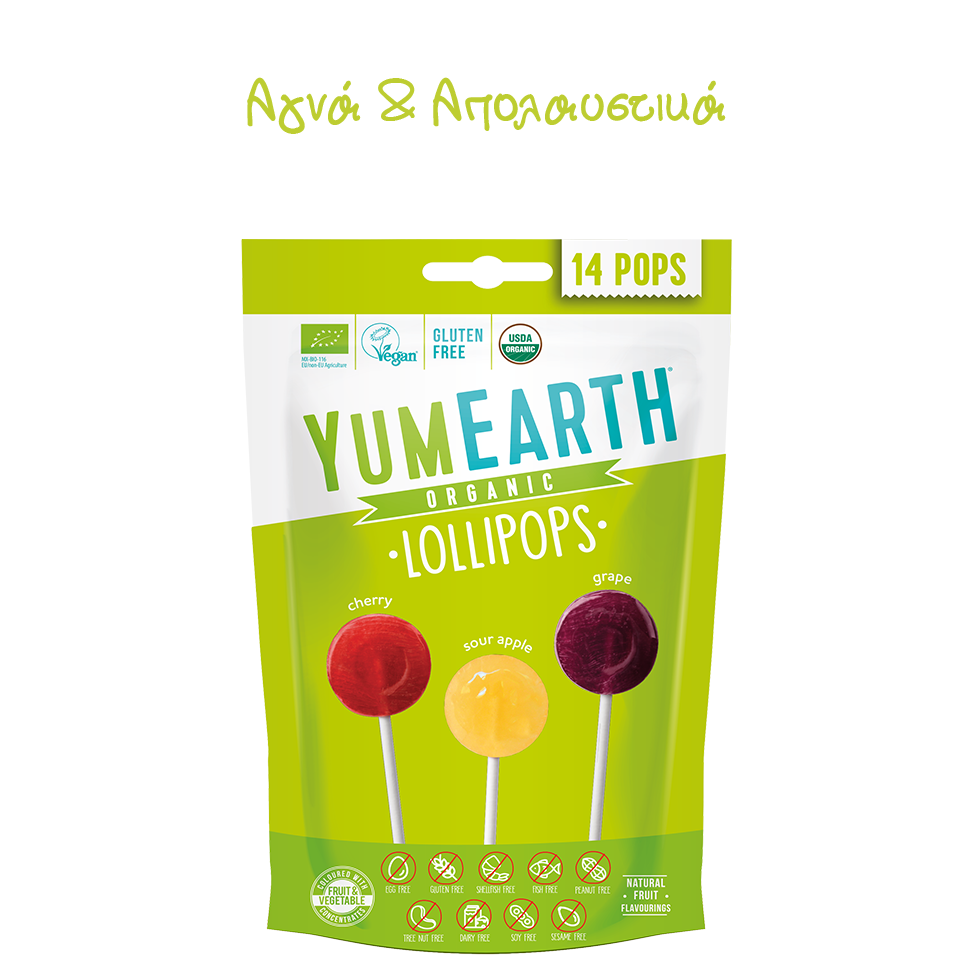 Yummy Earth τα καλύτερα γλειφιτζούρια του κόσμου. Αγνά και απολαυστικά από 100% φυσικά εκχυλίσματα βιολογικών φρούτων χωρίς αλλεργιογόνα και τεχνητά αρώματα. Με συστατικά όπως βιολογικό χυμό από ζαχαροκάλαμο, βιολογικό σιρόπι ταπιόκας και ρυζιού,εκχυλίσματα φρούτων, φυσικές γεύσεις από βιολογικά φρούτα όπως….φραγκοστάφυλο, πράσινο μήλο, μάνγκο, καρπούζι, ρόδι,πορτοκάλι, φράουλα, κεράσι, σταφύλι, βατόμουρο θα κάνουν όλους ευτυχισμένους !!!! Τα χρώματα προέρχονται από κόκκινο λάχανο, καρότο, κολοκύθα,μήλο,φραγκοστάφυλο. Τώρα μπορούμε να δίνουμε στα παιδιά μας άφοβα τα υπέροχα γλειφιτζούρια και καραμέλες Yum Εarth χωρίς ενοχές.Προϊόν vegan χωρίς γλουτένη, λακτόζη, σόγια, σιτάρι, αυγό, ξηρούς καρπούς, με βιολογικά συστατικά μόνο. Δεν υπάρχουν τεχνητές γεύσεις ή χρώματα.